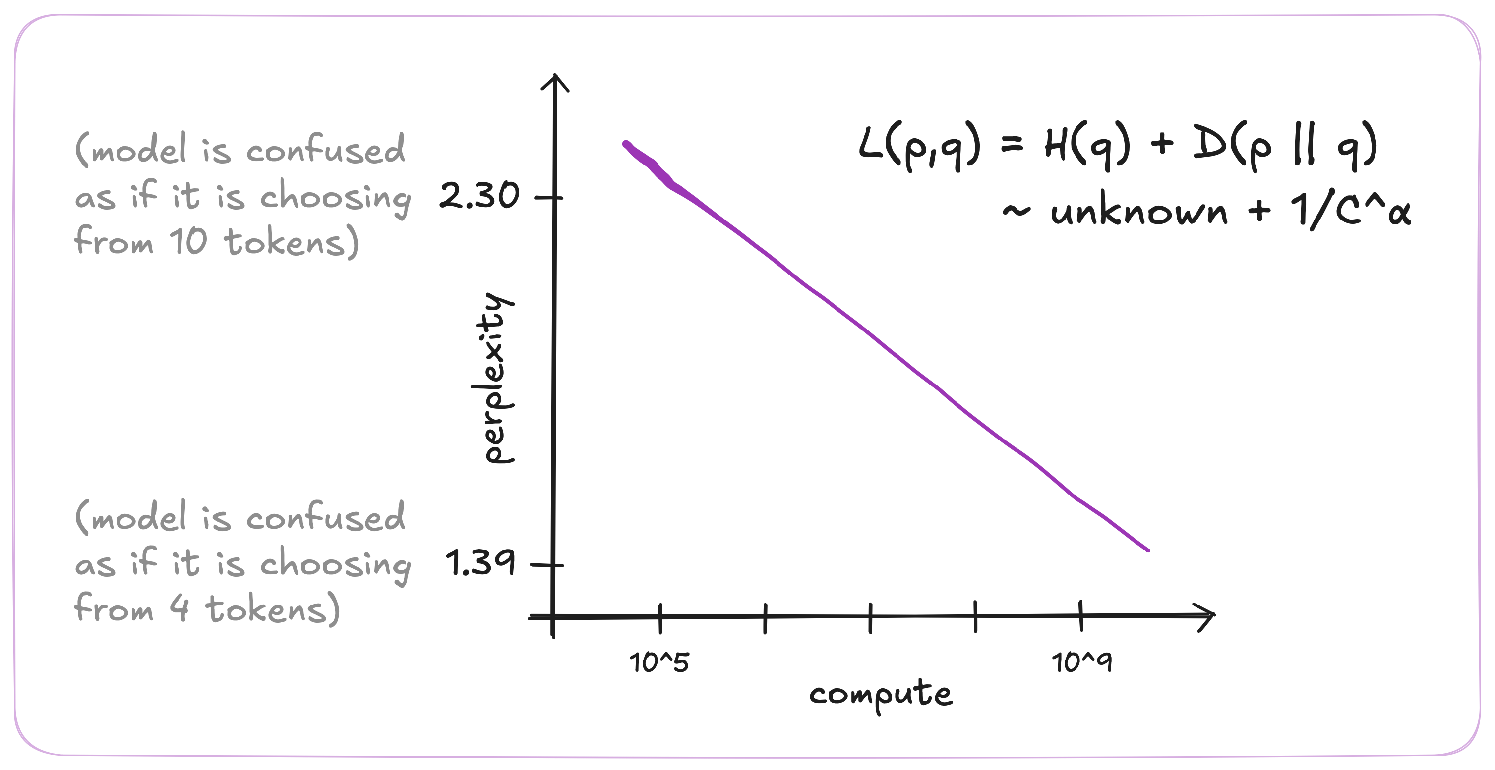 Large corpus of text have zipf-like distribution of tokens where the frequency of tokens follows a power-law. Predicting the next token over a massive text corpus is difficult, and it requires a complex model that can learn the statistical relationships between tokens. As model capacity increases, it allocates its computational budget to increasingly rare patterns. This creates smooth, predictable, diminishing-returns behavior, where x10 more compute yields roughly linear improvements in log-perplexity. The model is effectively “unlocking” a few more rare events at a time. This allows to make better predictions across many sentences, decreasing a bit the surprisal of multiple tokens. Since models can potentially store 16bits per parameter (assuming float16) and have up to billions of parameters, more compute can unlock new compression at scale since there is a lot of space. Furthermore, because the dataset has an intrinsic entropy, improvements must eventually plateau at an irreducible error.